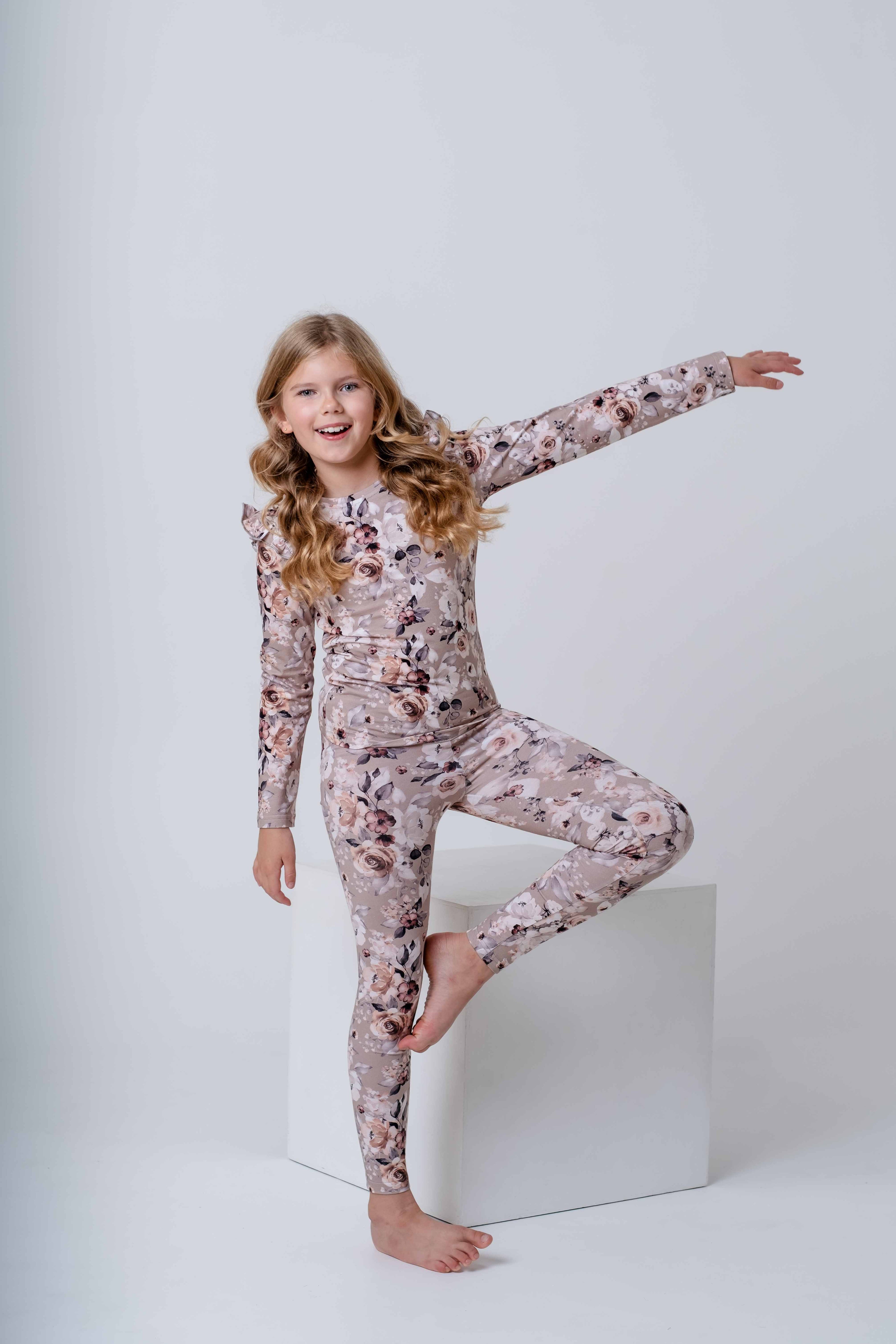 MIngnelin lasten pitkähihainen trikoopaita maanläheisessä taupen sävyssä kukkakuosilla. Tuote on valmistettu pehmeästä trikoosta ja siinä on frillat koristamassa olkapäällä joka tuo söpöä tyttömäisyyttä paitaan.