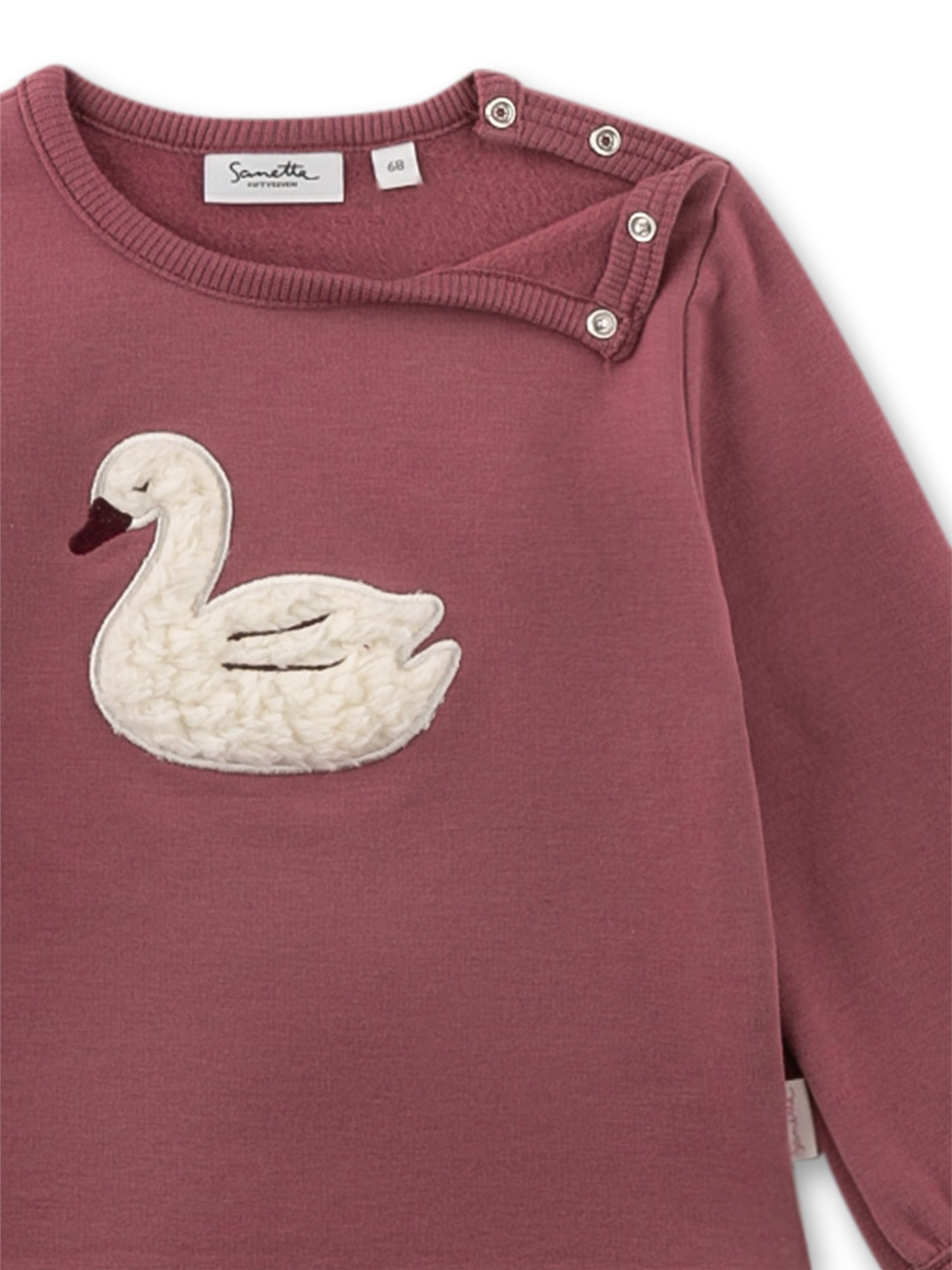 Sanetta pehmeä collegepaita pienille vauvoille ja tytöille kauniissa marjaisessa sävyssä. Pehmoinen kohokohta on pörröinen joutsenkuvio rinnassa, joka antaa paidalle söpön aksentin. Pehmeän kankaan ansiosta pienten collegepaita on erityisen mukava päällä ja tarjoaa runsaasti liikkumisvapautta. Hihojen kapeat hihansuut, joissa on kevyet röyhelöt, takaavat mukavan istuvuuden ja tyttömäisen ilmeen.