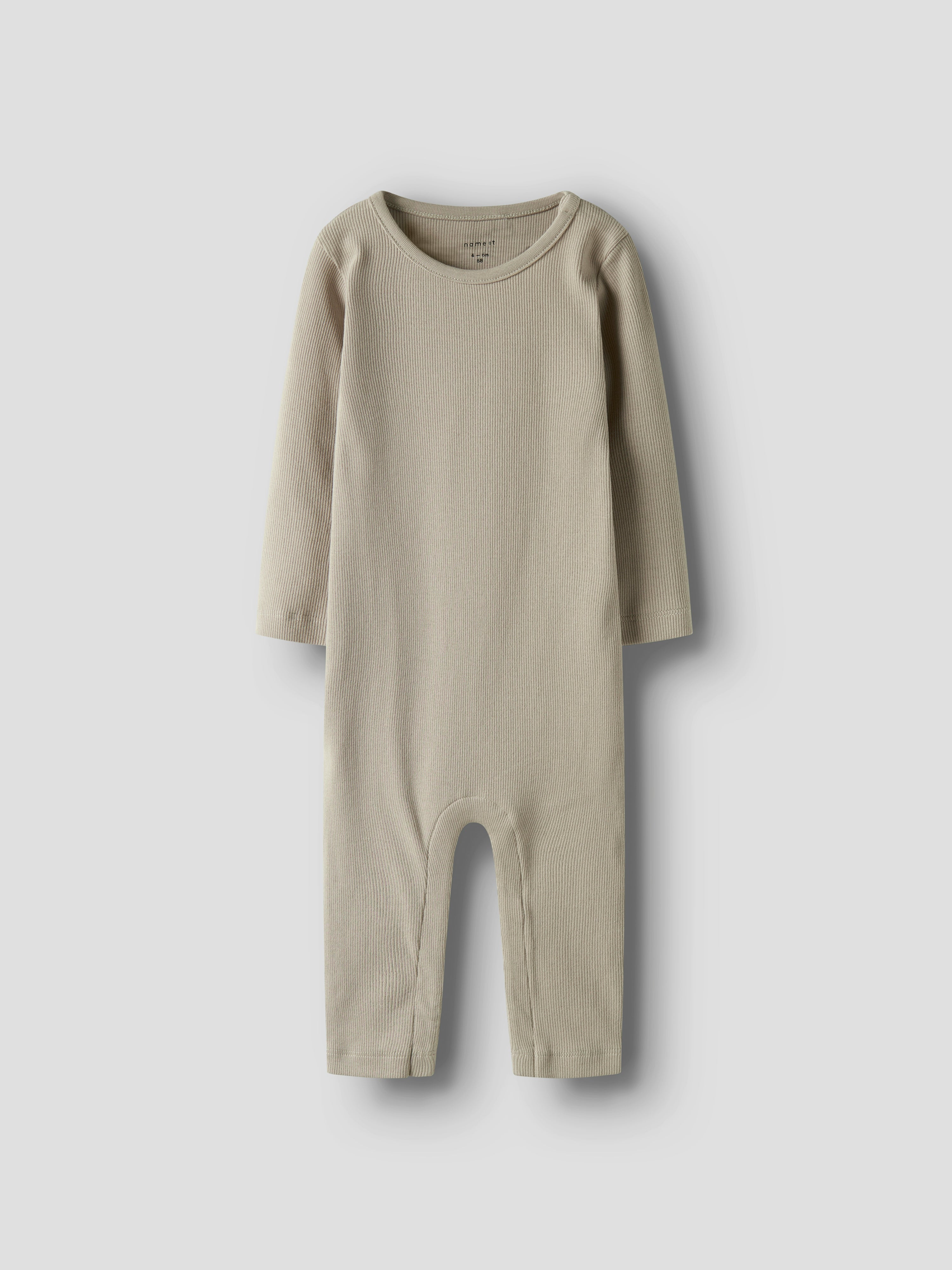 Name It vauvan haalari, kokopuku. Ribbineuloksessa on pystysuora raitakuvio. Kankaan joustavuus tekee siitä sekä mukavan tuntuisen että ajattoman näköisen. PItkähihainen kokopuku jossa painonapit haarassa helpottamassa vaipan vaihtoa.