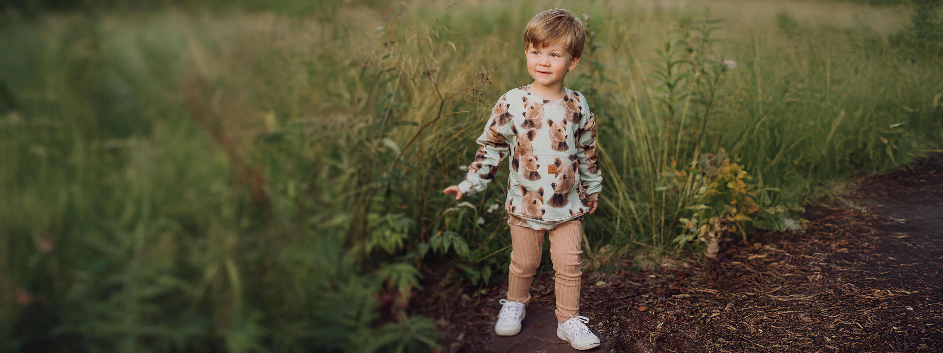 Metsola Bear Pocket Sweater -collegepaita lapsille. Paidassa toistuu Henna Adelin rakastettu Bear-kuosi, jossa lempeät karhut seikkailevat heleän vihreällä Spring Green -taustalla.