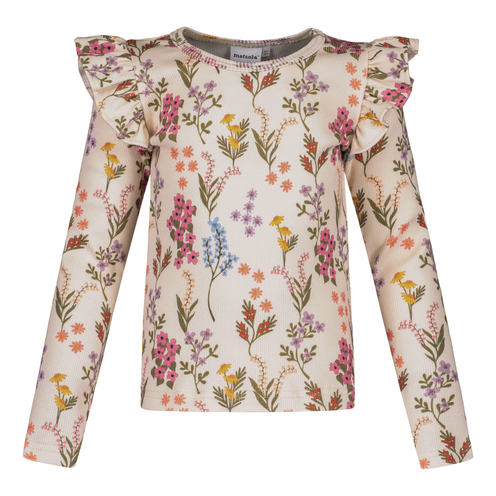 Metsolan frilla paita on valmistettu luomupuuvillasta ja on materiaalina erittäin miellyttävän tuntuinen. Lasten trikoopaita tuntuu pehmeältä iholla sekä on joustava ja kestävä laadultaan. Lasten pitkähihaisessa paidassa on syksyinen kukka tunnelma. Yhdistä saman sävyisiin leggingseihin.
